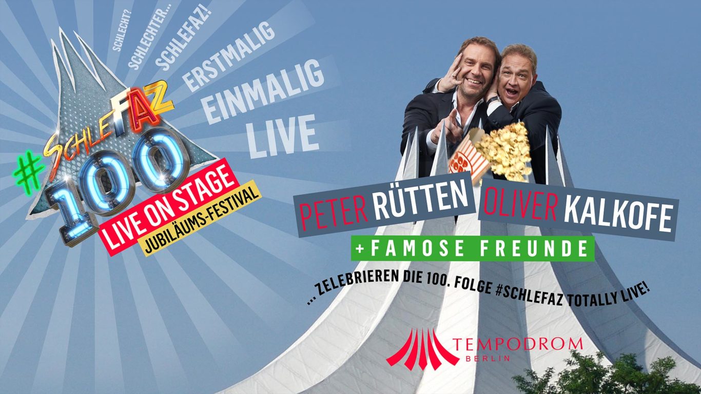 Die Hüter des heiligen Scheissfilm-Grals – Oliver Kalkofe und Peter Rütten erobern das Tempodrom zu Berlin, um dort gemeinsam mit tausenden televisionär-traumatisierten Trashfilmfreunden ein fulminant-furios-furchtbares Festival des schlechten Geschmacks zu zelebrieren. Die kongenialen Kackfilm-Könige präsentieren die 100. Folge ihrer kuriosen Kultshow „SchleFaZ – Die schlechtesten Filme aller Zeiten“ zum Jubiliäum endlich komplett LIVE und in Farbe vor ihrem treuen Publikum!