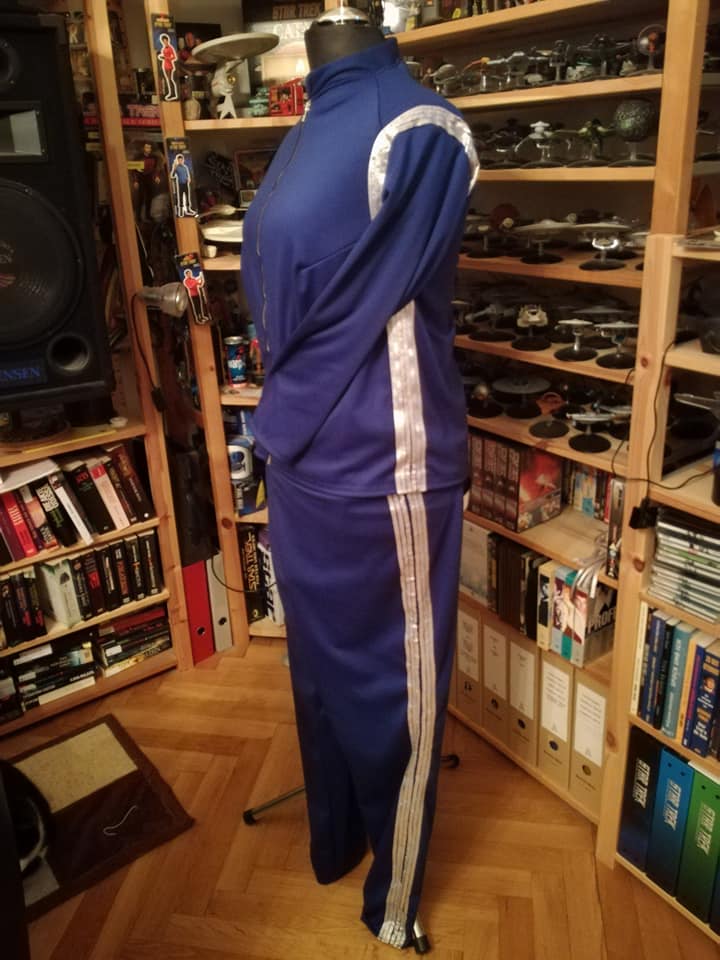 Bin nun seit Ewigkeiten dabei, die Streifen an der Uniform anzubringen. Einzelstreifen abgemessen, zugeschnitten und dann natürlich die Enden ordentlich bearbeitet, damit diese nicht ausfransen. Hab mir Stoffkleber gekauft, sie zweimal eingebogen und geklebt und dann genäht. Es sind insgesamt 34 Streifen, die da zum Annähen sind. Alles mit der Hand, denn erstens komm ich mit der Maschine bei der Hose schon mal gar nicht dazu und außerdem ist das so ein recht empfindliches Band, das bleibt an der Nadel der Maschine hängen (hatte ich bei einem anderen Kostüm schon mal) und zieht dann Fäden.
