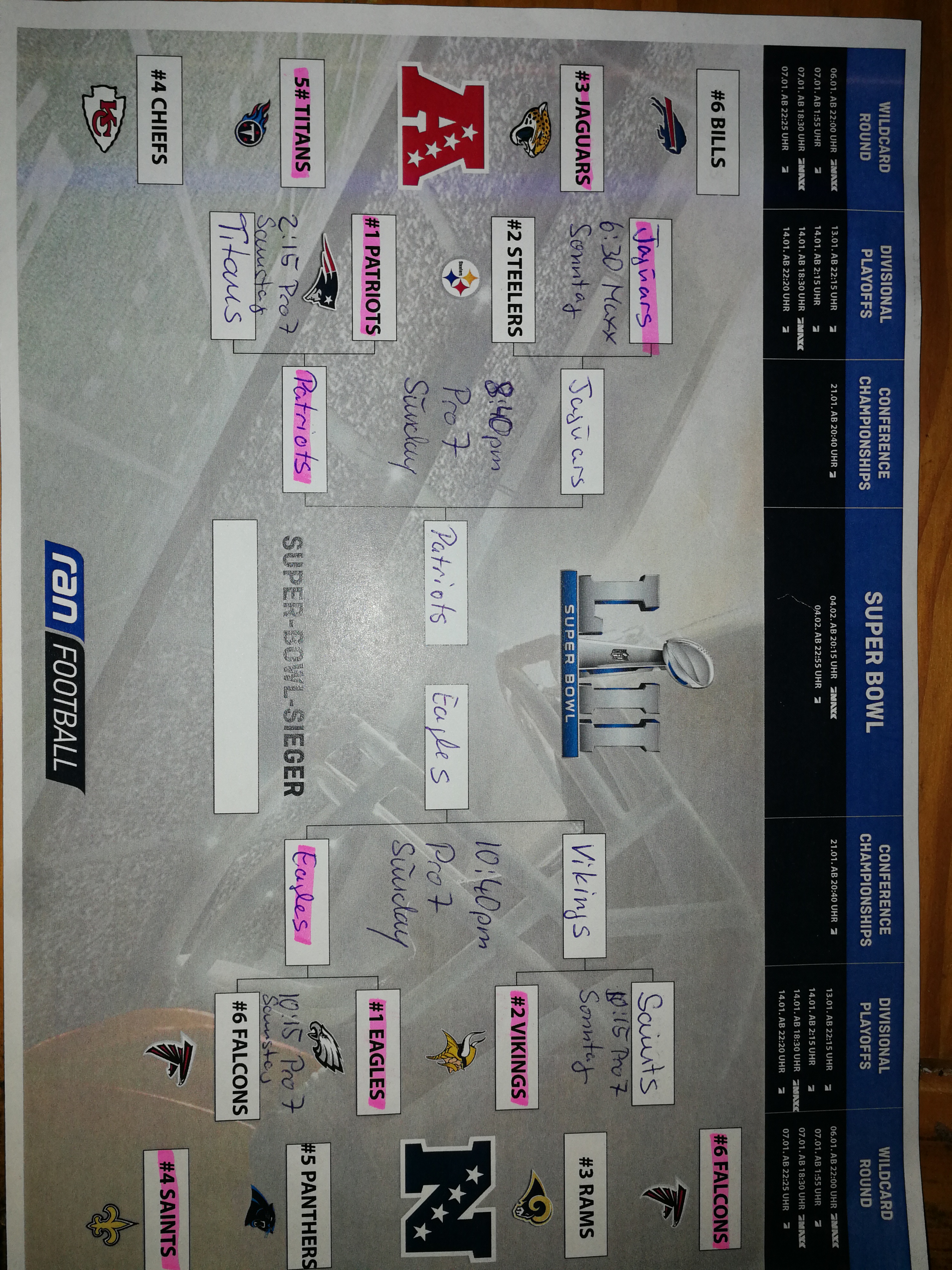 Wenn mich jemand sucht, ich bin diejenige die oben im Turm sitzt und lautstark die Patriots und die Vikings anfeuert und auf das Beste hofft. Denn heute wird entschieden wer in zwei Wochen den Superbowl spielt.