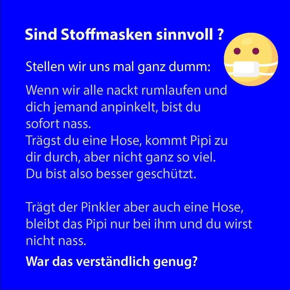 Und ich stimme zu - Masken gibt es mittlerweile überall. Ich hab meine selber gemacht mit Youtube-Videos. Ich hab nix gebraucht außer einer Schere und ein altes T-Shirt. Beides sollte ja nun eigentlich jeder zu Hause haben, man braucht nichts einzukaufen. Man muss nur wollen. Niemand erwartet von uns, dass wir die Masken tragen, die es in Krankenhäusern gibt - das sollen wir auch nicht, die Masken sollen dem medizinischen Personal vorbehalten sein - dass es da Engpässe gibt ist allerdings durchaus etwas, das man anprangern kann und muss. Und wenn man nun wirklich gar keine Maske hat, tut es auch ausdrücklich ein Schal. Wie gesagt, man muss nur wollen. Aber da hapert es eben bei vielen, die das ja nun mal überhaupt nicht einsehen.