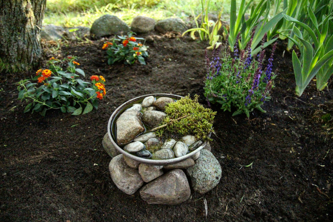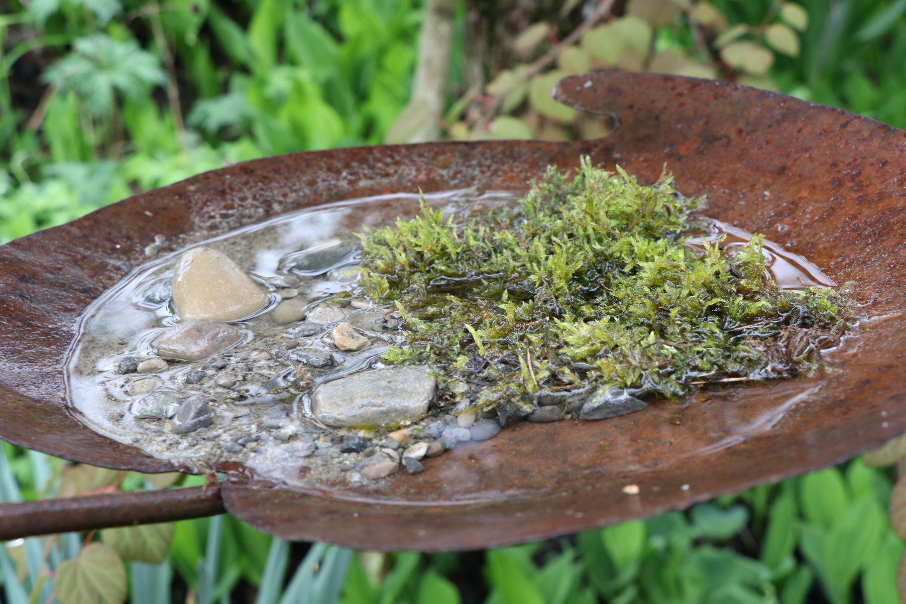 Ins Beet stecken. Damit die Bienen eine "Insel" zum landen haben, gerne in die Muscheln eine Murmel legen. Bitte Regenwasser verwenden, da sind die meisten Mineralien drin. Kein Leitungswasser.