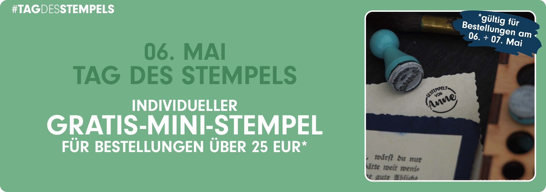 Bestell für mindestens 25 EUR dieses Wochenende am 06. oder 07. Mai bei mir und du bekommst ohne weiteres Zutun einen kostenfreien individualisierten Mini-Stempel "gestempelt von:" mit deinem Vornamen (Name in der Rechnungsanschrift) dazu.