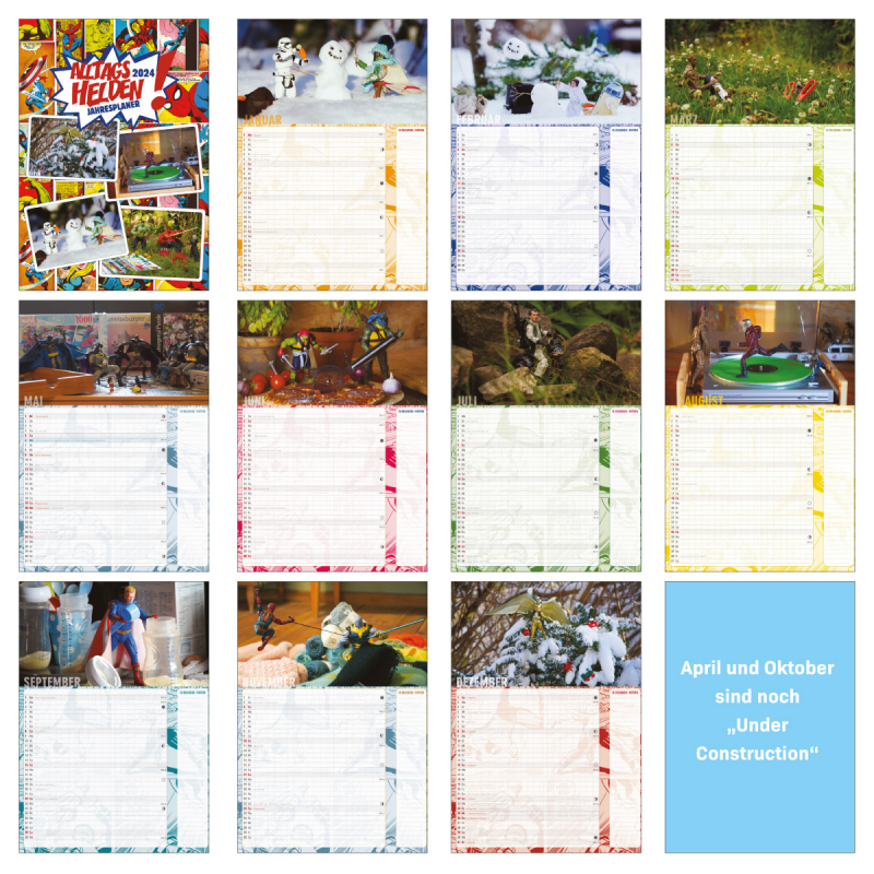 Seit Jahren schieße ich leidenschaftlich gern Fotos. Da ich es liebe meine Termine analog mit Stift in einen Kalender einzutragen entstand dieser ganz besondere Jahresplaner, der nur aus eigener Liebe zu Superhelden und Actionfiguren entstand. Wer sich also durch 12 bunte Monate von Alltagshelden begleiten lassen möchte, kann dies hiermit gern tun.