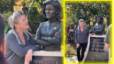OCTOBER 25, 2022 - Almost three years to the day, we told you about the announced efforts to build a statue of Captain Kathryn Janeway in the town where she will be born, on May 20 2336, in Bloomington, Indiana. That statue has since been completed, unveiled, and, after pandemic-imposed delays, Kate Mulgrew has finally been able to pay Janeway a visit in person. That happened over the weekend.