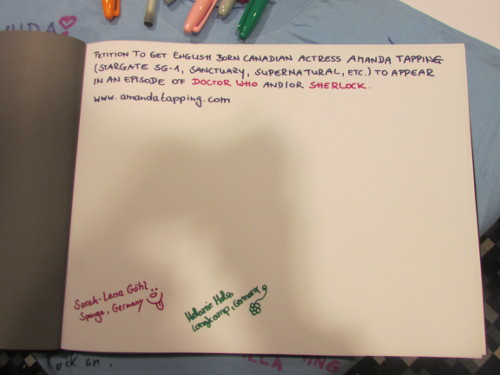 Wollte nicht AMANDA TAPPING ein Doctor werden....ihre Organisation "Sanctuary for Kids" hatte bei FedCon 23 einen Stand, an dem man sich in ein Buch eintragen konnte, mit der Forderung, dass sie der nächste Doctor werden will...lasst mich mal in den Fotos wühlen...