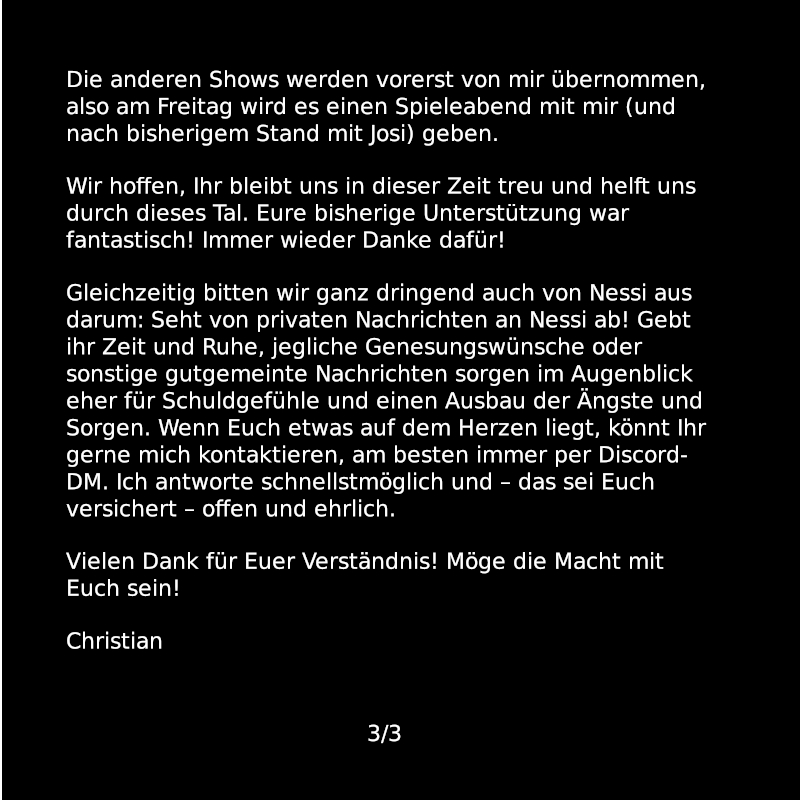 Heute Abend war eigentlich der Thementalk geplant, aber wir müssen ihn erstmal verschieben. Details dazu auf Discord.