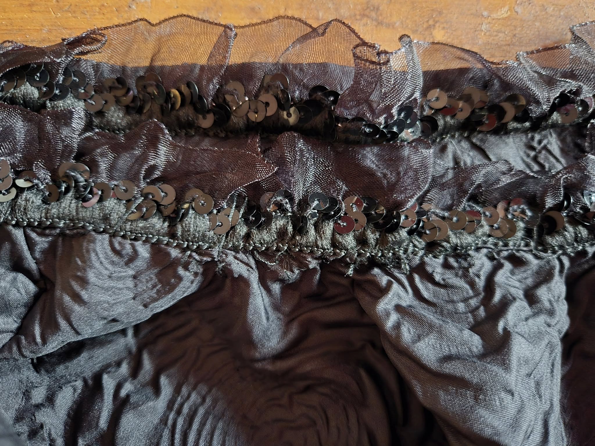 Die Oberkante ist übrigens nicht schief, das hängt nur nicht ganz glatt auf der Schneiderpuppe drauf. Der Kragen ist allerdings wirklich so vernudelt, wie er aussieht.