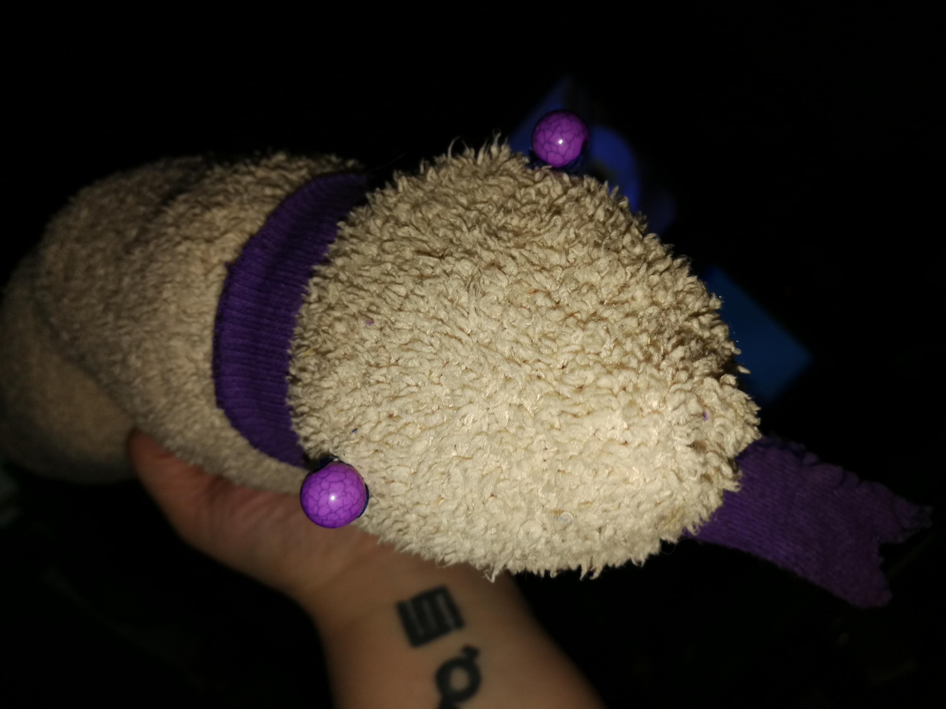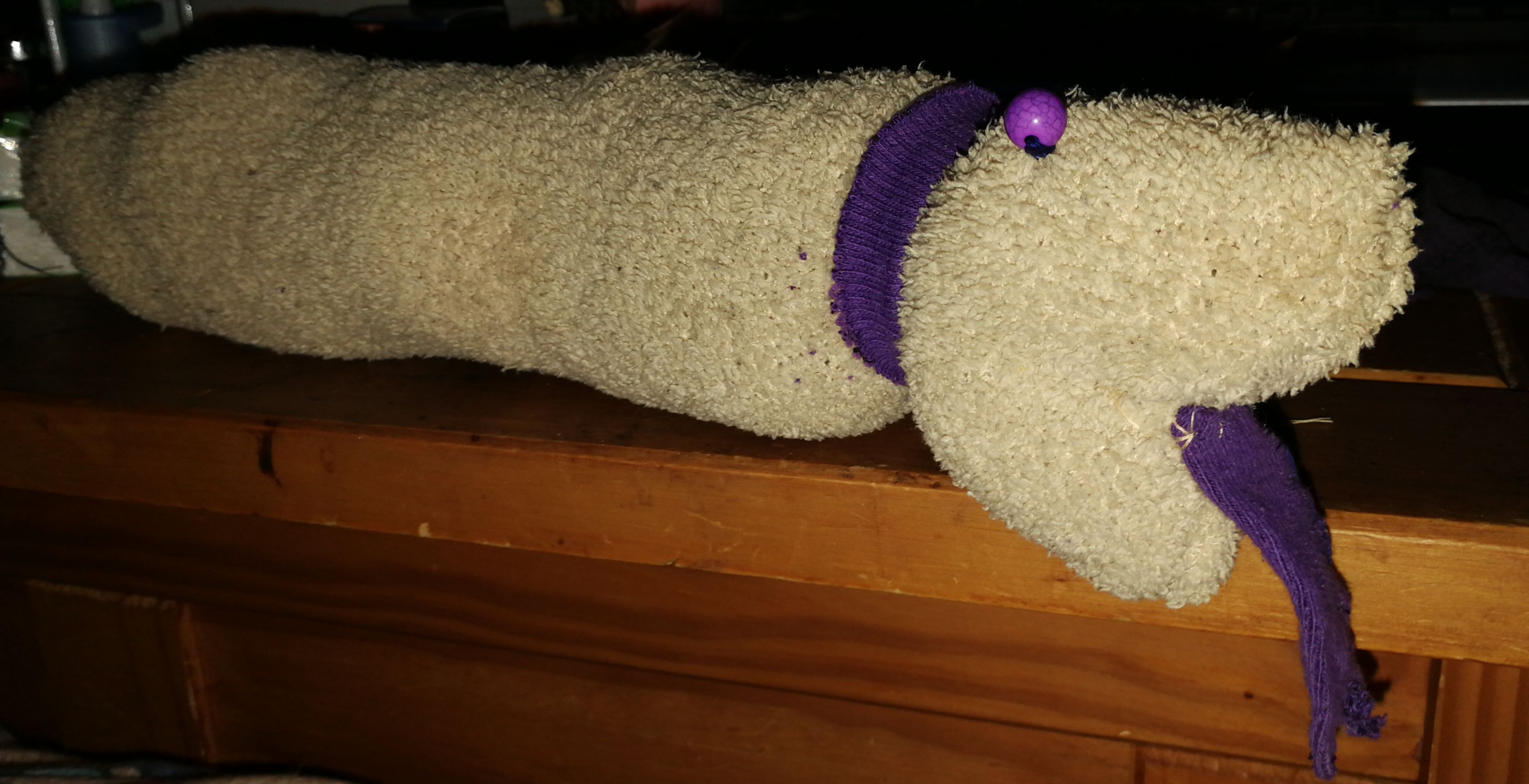 Ich hatte heute Langeweile und habe eine alte Strumpfhose meiner Tochter in ein Sockentier verwandelt.