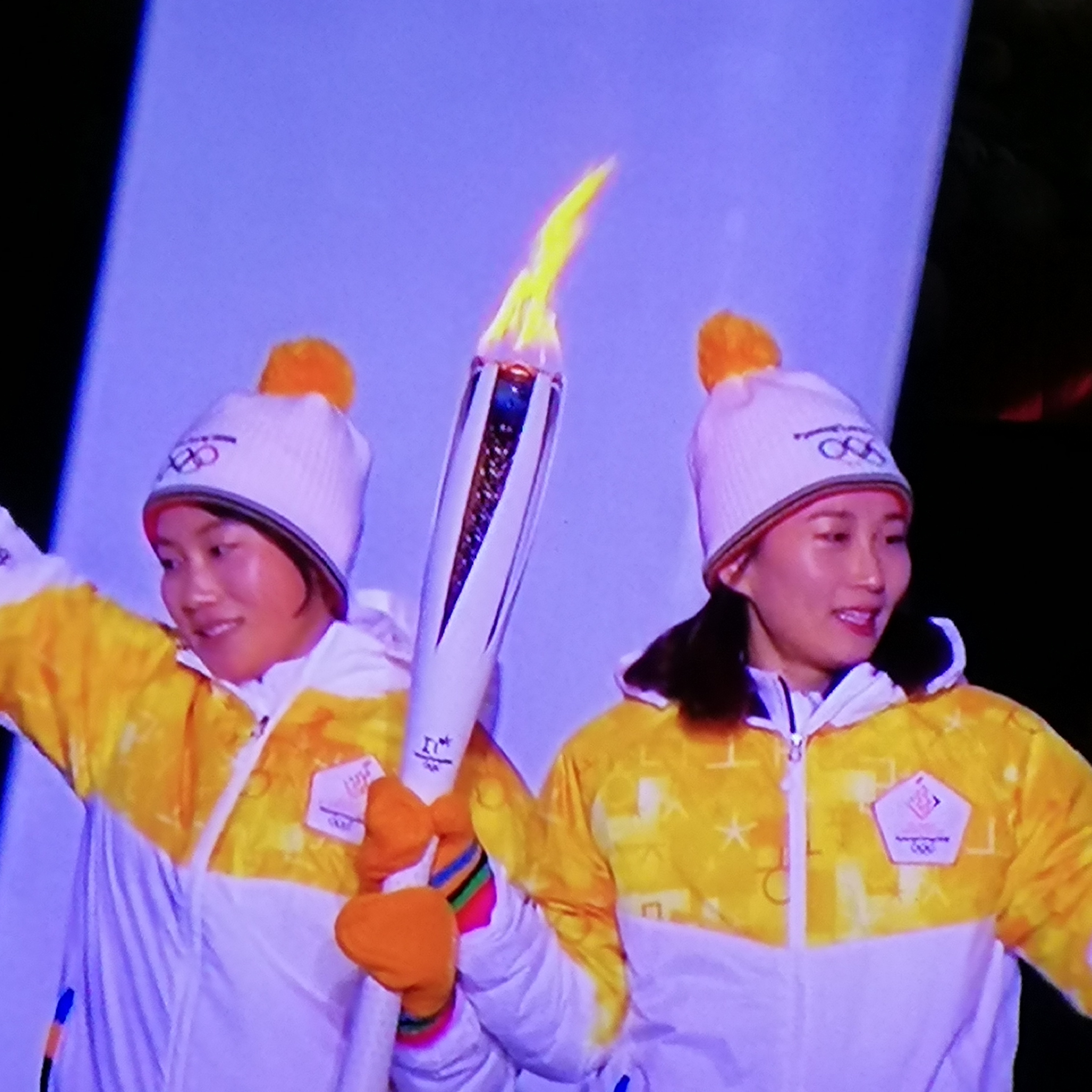 Und ein besonderer Moment war dieser hier. Eine Nordkoreanische und eine Südkoreanische Athletin haben die Fackel getragen. Zusammen. Wunderschön.